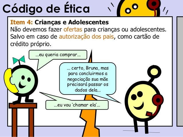 - 10. Código de Ética Item 4: Crianças e Adolescentes Não devemos fazer ofertas para crianças ou adolescentes. Salvo em caso de autorização dos pais, como cartão de crédito próprio. ...eu queria comprar... ... certo, Bruna, mas para concluirmos a negociação sua mãe precisará passar os dados dela... ...eu vou ‘chamar ela’...