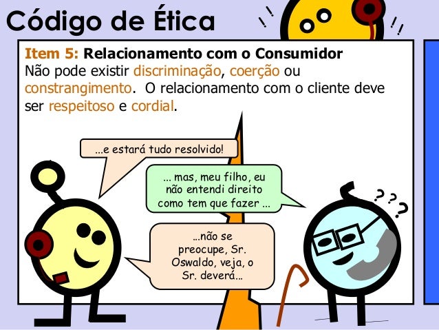 - 11. Código de Ética Item 5: Relacionamento com o Consumidor Não pode existir discriminação, coerção ou constrangimento. O relacionamento com o cliente deve ser respeitoso e cordial. ...e estará tudo resolvido! ... mas, meu filho, eu não entendi direito como tem que fazer ... ...não se preocupe, Sr. Oswaldo, veja, o Sr. deverá...