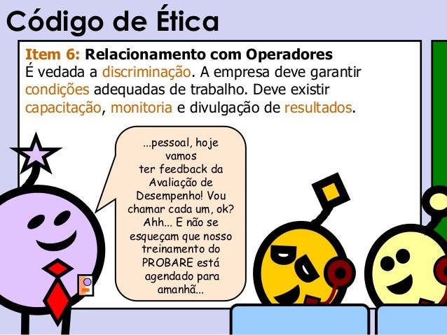 - 12. Código de Ética Item 6: Relacionamento com Operadores É vedada a discriminação. A empresa deve garantir condições adequadas de trabalho. Deve existir capacitação, monitoria e divulgação de resultados. ...pessoal, hoje vamos ter feedback da Avaliação de Desempenho! Vou chamar cada um, ok? Ahh... E não se esqueçam que nosso treinamento do PROBARE está agendado para amanhã...