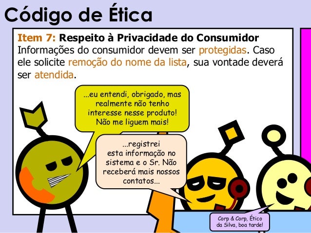 - 13. Código de Ética Item 7: Respeito à Privacidade do Consumidor Informações do consumidor devem ser protegidas. Caso ele solicite remoção do nome da lista, sua vontade deverá ser atendida. ...eu entendi, obrigado, mas realmente não tenho interesse nesse produto! Não me liguem mais! ...registrei esta informação no sistema e o Sr. Não receberá mais nossos contatos... Corp & Corp, Ético da Silva, boa tarde!