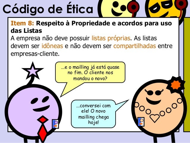 - 14. Código de Ética Item 8: Respeito à Propriedade e acordos para uso das Listas A empresa não deve possuir listas próprias. As listas devem ser idôneas e não devem ser compartilhadas entre empresas-cliente. ...e o mailling já está quase no fim. O cliente nos mandou o novo? ...conversei com ele! O novo mailling chega hoje!