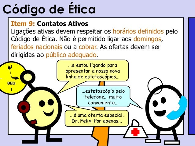 - 15. Código de Ética Item 9: Contatos Ativos Ligações ativas devem respeitar os horários definidos pelo Código de Ética. Não é permitido ligar aos domingos, feriados nacionais ou a cobrar. As ofertas devem ser dirigidas ao público adequado. SEG ...e estou ligando para apresentar a nossa nova linha de estetoscópios... ...estetoscópio pelo telefone... muito conveniente... ...é uma oferta especial, Dr. Felix. Por apenas...