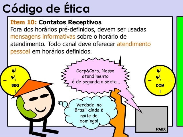 - 16. Código de Ética Item 10: Contatos Receptivos Fora dos horários pré-definidos, devem ser usadas mensagens informativas sobre o horário de atendimento. Todo canal deve oferecer atendimento pessoal em horários definidos. DOM PABX Corp&Corp. Nosso atendimento é de segunda a sexta... Verdade, no Brasil ainda é noite de domingo! SEG