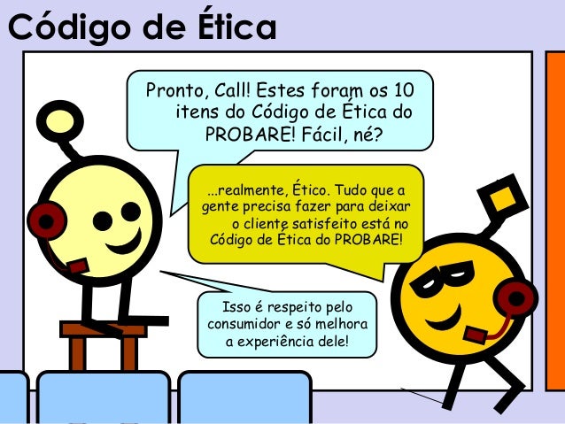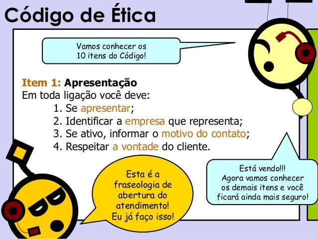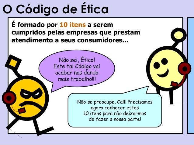 - 6. O Código de Ética É formado por 10 itens a serem cumpridos pelas empresas que prestam atendimento a seus consumidores... Não sei, Ético! Este tal Código vai acabar nos dando mais trabalho!!! Não se preocupe, Call! Precisamos agora conhecer estes 10 itens para não deixarmos de fazer a nossa parte!