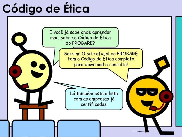 - 18. Código de Ética E você já sabe onde aprender mais sobre o Código de Ética do PROBARE? Sei sim! O site oficial do PROBARE tem o Código de Ética completo para download e consulta! Lá também está a lista com as empresas já certificadas!
