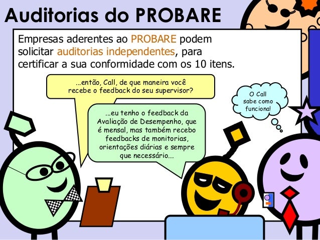 - 19. Auditorias do PROBARE Empresas aderentes ao PROBARE podem solicitar auditorias independentes, para certificar a sua conformidade com os 10 itens. ...então, Call, de que maneira você recebe o feedback do seu supervisor? ...eu tenho o feedback da Avaliação de Desempenho, que é mensal, mas também recebo feedbacks de monitorias, orientações diárias e sempre que necessário... O Call sabe como funciona!