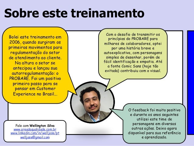 - 2. Sobre este treinamento Bolei este treinamento em 2006, quando surgiram os primeiros movimentos para regulamentação do setor de atendimento ao cliente. Na altura o setor se antecipou e lançou sua autorregulamentação: o PROBARE. Foi um positivo primeiro passo para se pensar em Customer Experience no Brasil... Fale com Wellington Silva www.areadaqualidade.com.br www.linkedin.com/in/welljose/pt welljose@gmail.com Com o desafio de transmitir os princípios do PROBARE para milhares de colaboradores, optei por uma história breve e autoexplicativa, com personagens simples de desenhar, porém de fácil identificação e empatia. Até a fonte Comic Sans (hoje tão evitada) contribuiu com o visual. O feedback foi muito positivo e durante os anos seguintes utilizei este time de personagens em diversas outras ações. Deixo agora disponível para sua referência e aprendizado.