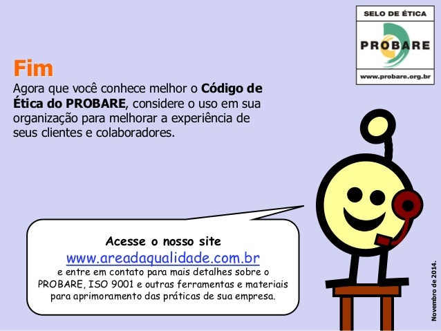 - 20. Fim Agora que você conhece melhor o Código de Ética do PROBARE, considere o uso em sua organização para melhorar a experiência de seus clientes e colaboradores. Acesse o nosso site www.areadaqualidade.com.br e entre em contato para mais detalhes sobre o PROBARE, ISO 9001 e outras ferramentas e materiais para aprimoramento das práticas de sua empresa.