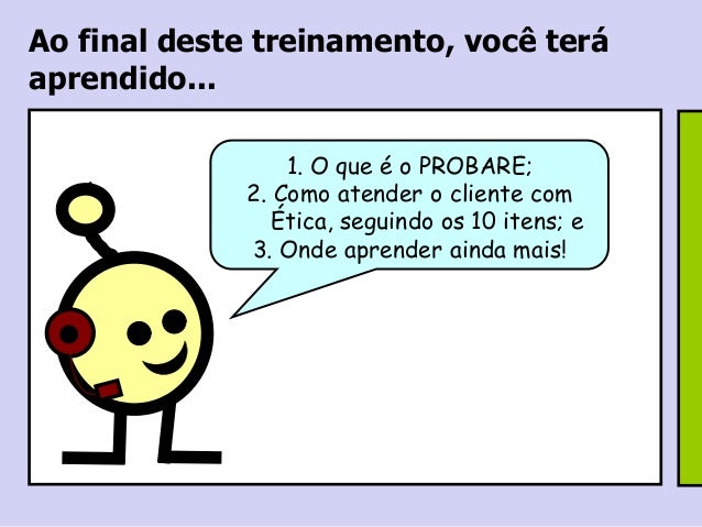 - 3. Ao final deste treinamento, você terá aprendido... 1. O que é o PROBARE; 2. Como atender o cliente com Ética, seguindo os 10 itens; e 3. Onde aprender ainda mais!