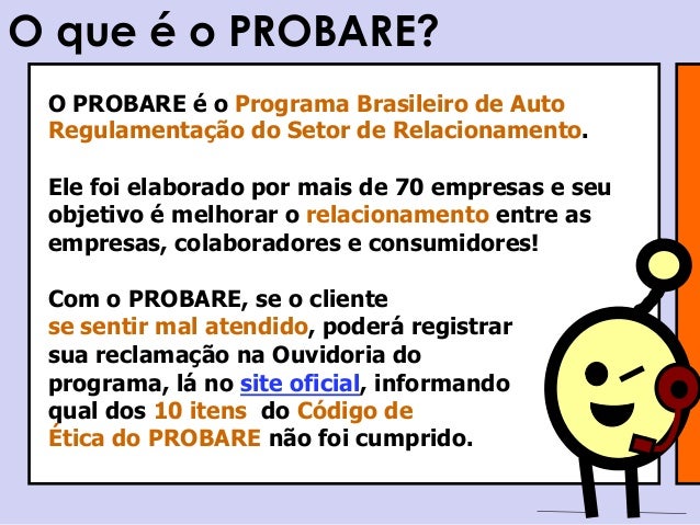 - 5. O que é o PROBARE? O PROBARE é o Programa Brasileiro de Auto Regulamentação do Setor de Relacionamento. Ele foi elaborado por mais de 70 empresas e seu objetivo é melhorar o relacionamento entre as empresas, colaboradores e consumidores! Com o PROBARE, se o cliente se sentir mal atendido, poderá registrar sua reclamação na Ouvidoria do programa, lá no site oficial, informando qual dos 10 itens do Código de Ética do PROBARE não foi cumprido.