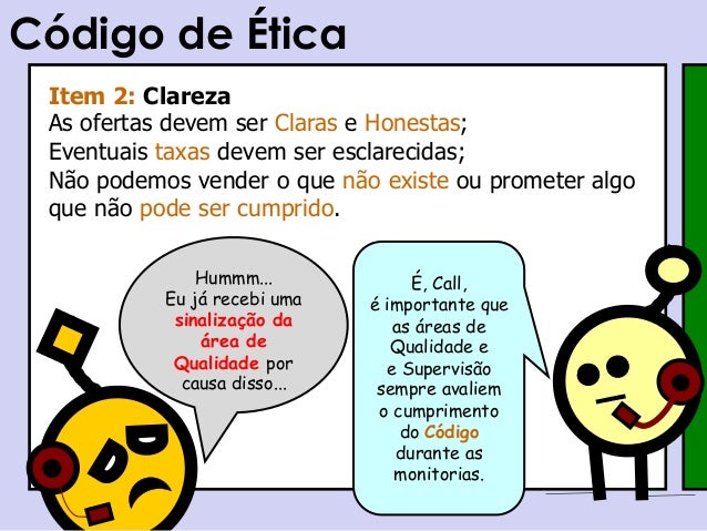 - 8. Código de Ética Item 2: Clareza As ofertas devem ser Claras e Honestas; Eventuais taxas devem ser esclarecidas; Não podemos vender o que não existe ou prometer algo que não pode ser cumprido. Hummm... Eu já recebi uma sinalização da área de Qualidade por causa disso... É, Call, é importante que as áreas de Qualidade e e Supervisão sempre avaliem o cumprimento do Código durante as monitorias.