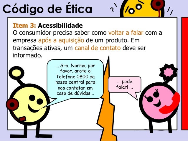 - 9. Código de Ética Item 3: Acessibilidade O consumidor precisa saber como voltar a falar com a empresa após a aquisição de um produto. Em transações ativas, um canal de contato deve ser informado. ... Sra. Norma, por favor, anote o Telefone 0800 da nossa central para nos contatar em caso de dúvidas... ... pode falar! ...